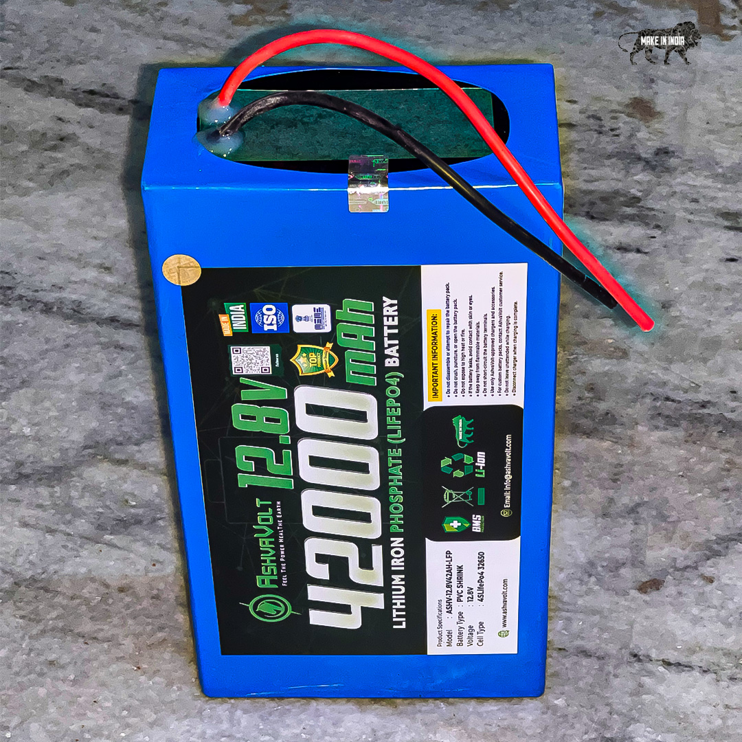AshvaVolt 12.8V 42Ah portable battery pack is a compact, safe and economical LifePo4 battery pack. This standalone battery pack is designed with high power LFP Li-Phosphate Cells.