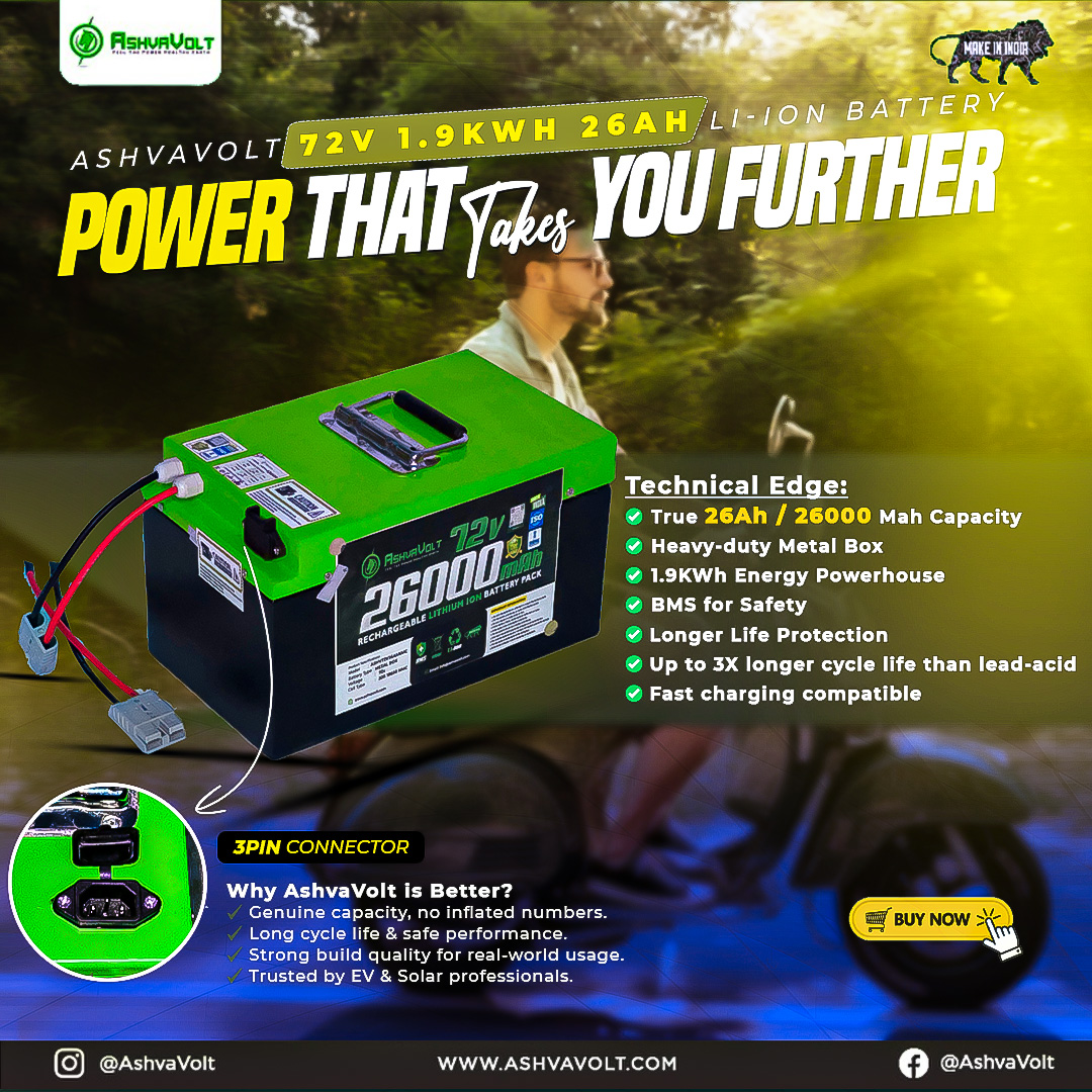 AshvaVolt 72V 26Ah portable battery pack is a compact, safe and economical Li-Ion battery pack. This standalone battery pack is designed for Electric Vehicle (Bike and Scooty) with high power NMC Li-Ion Cells.